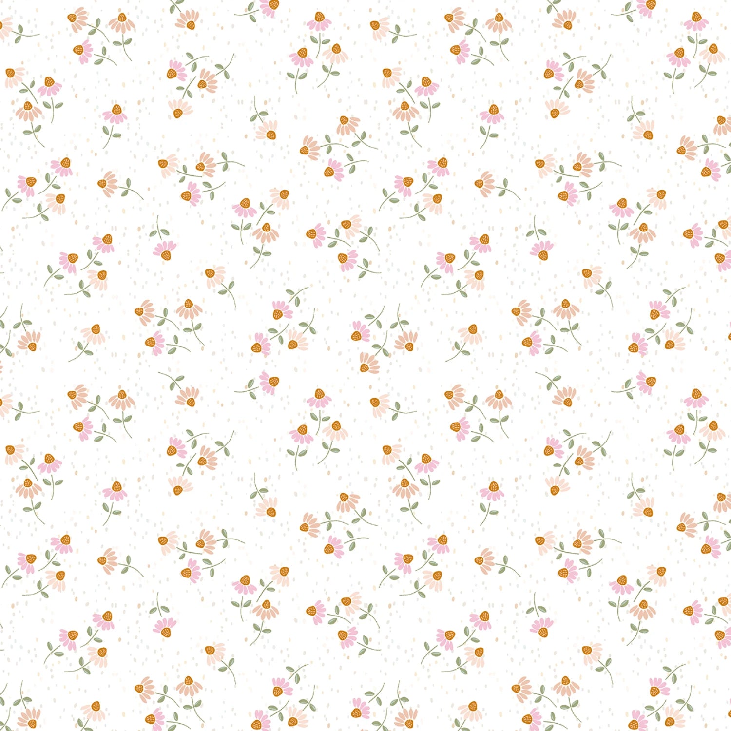 This fabric features a charming ditsy floral pattern with delicate pink and orange flowers scattered across a white background, creating a light and airy feel perfect for various sewing projects. The small-scale floral design adds a touch of whimsy, making it ideal for crafting quilts, dresses, or home decor items that require a subtle yet elegant touch.