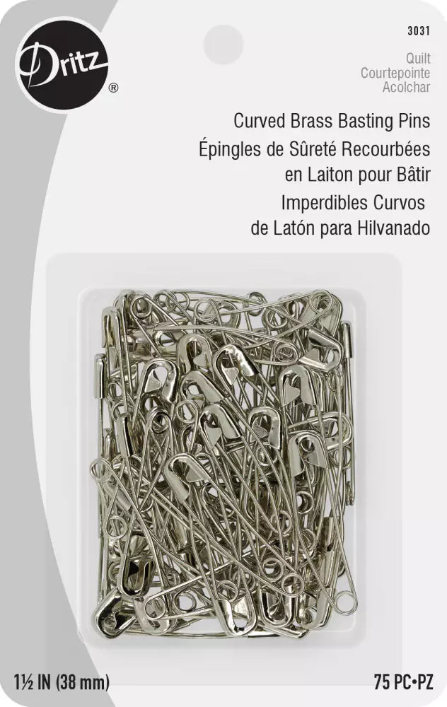 Quilt Basting is easy with the Dritz Quilting Curved Brass Basting Pins. These curved safety pins are a great alternative to straight safety pins as they're designed with the perfect angle to penetrate quilt fabric layers without shifting them. Use these brass quilt basting pins and make your quilting projects effortless and safe. This package contains 75 1-1/2" curved brass basting pins.