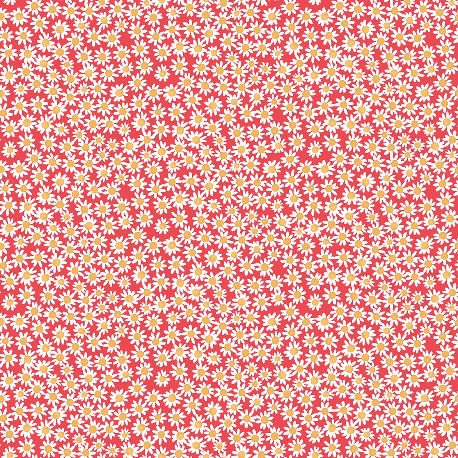 This vibrant fabric features a delightful pattern of small white daisies scattered across a rich raspberry red background, creating a charming and lively visual effect perfect for a variety of crafting and sewing projects. The design's playful yet elegant aesthetic makes it ideal for both traditional and contemporary styles, enhancing any project with a touch of floral whimsy.