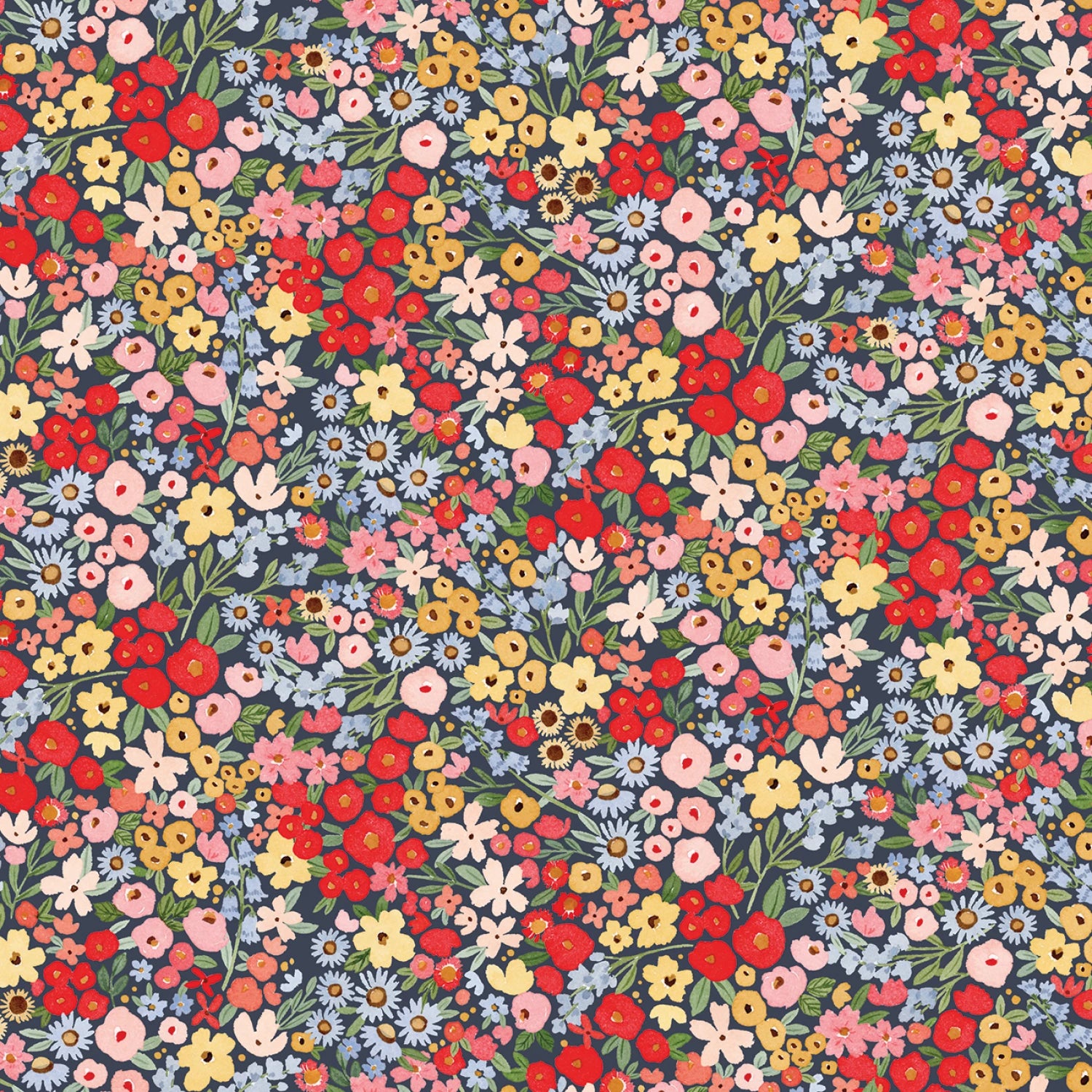 This charming fabric features a delightful ditsy floral pattern with a mix of vibrant red, pink, yellow, and blue flowers set against a soft blue background. The design exudes a cheerful and whimsical vibe, perfect for adding a touch of springtime joy to any project. The fabric's traditional Oxford weave provides a sturdy yet soft texture, ideal for a variety of sewing applications from quilting to apparel.