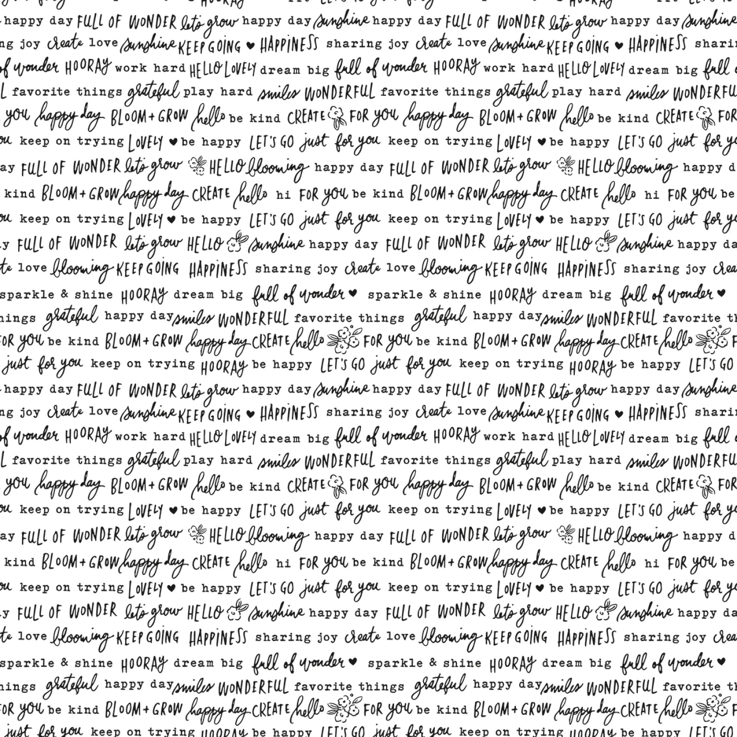 This fabric features a charming white background adorned with a delightful array of words and phrases in a playful, handwritten style, promoting positivity and creativity. The design includes phrases like "Create for you," "Let's go," "Hello," and "Wonderful," interspersed with small, whimsical icons such as flowers and stars, creating a joyful and inspiring aesthetic perfect for various crafting projects.