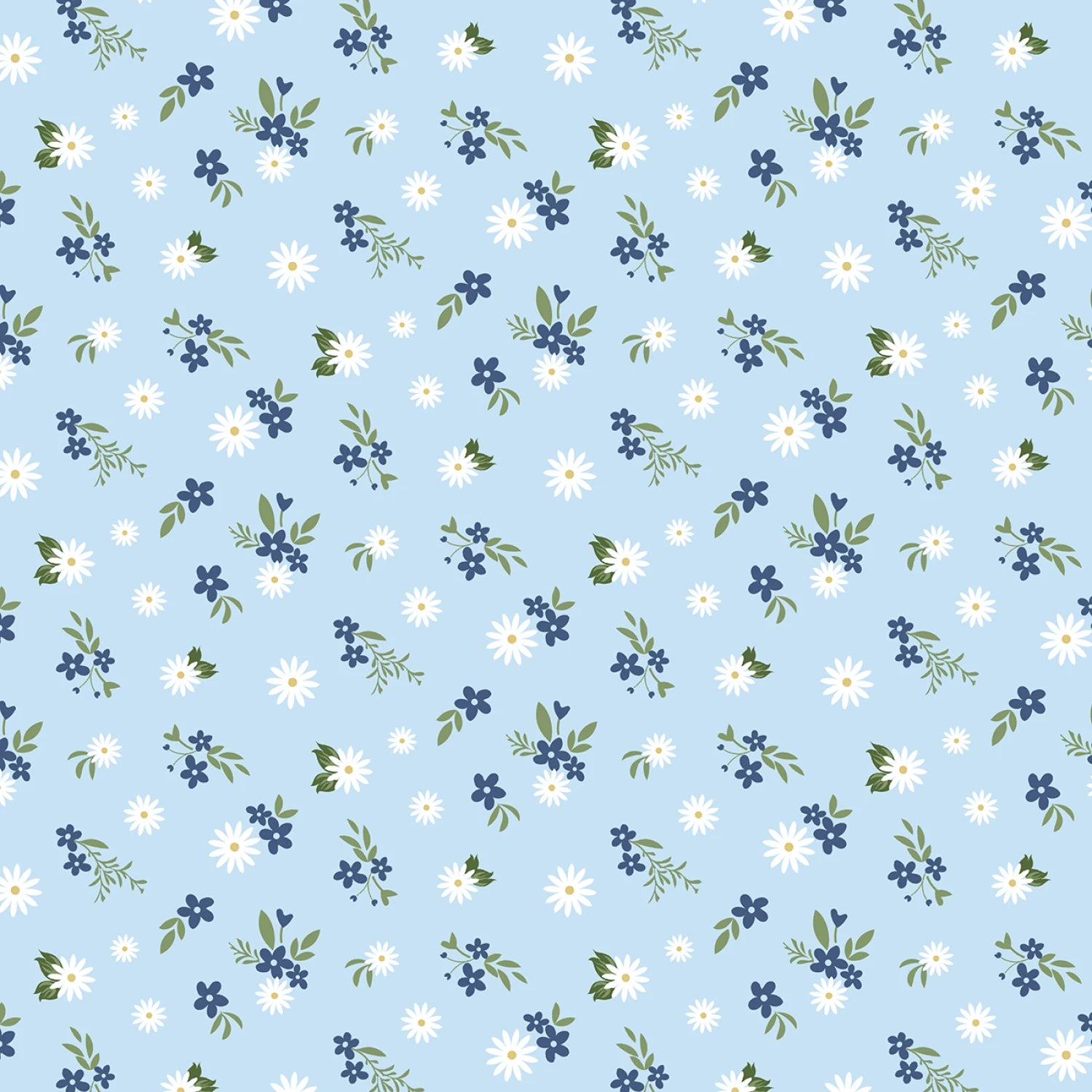 This charming fabric features a delightful light blue background adorned with a mix of white daisies and small blue and green floral clusters, creating a fresh and airy design perfect for spring and summer projects. Its soft, 100% cotton texture ensures comfort and breathability, making it ideal for a variety of sewing applications from apparel to home decor.